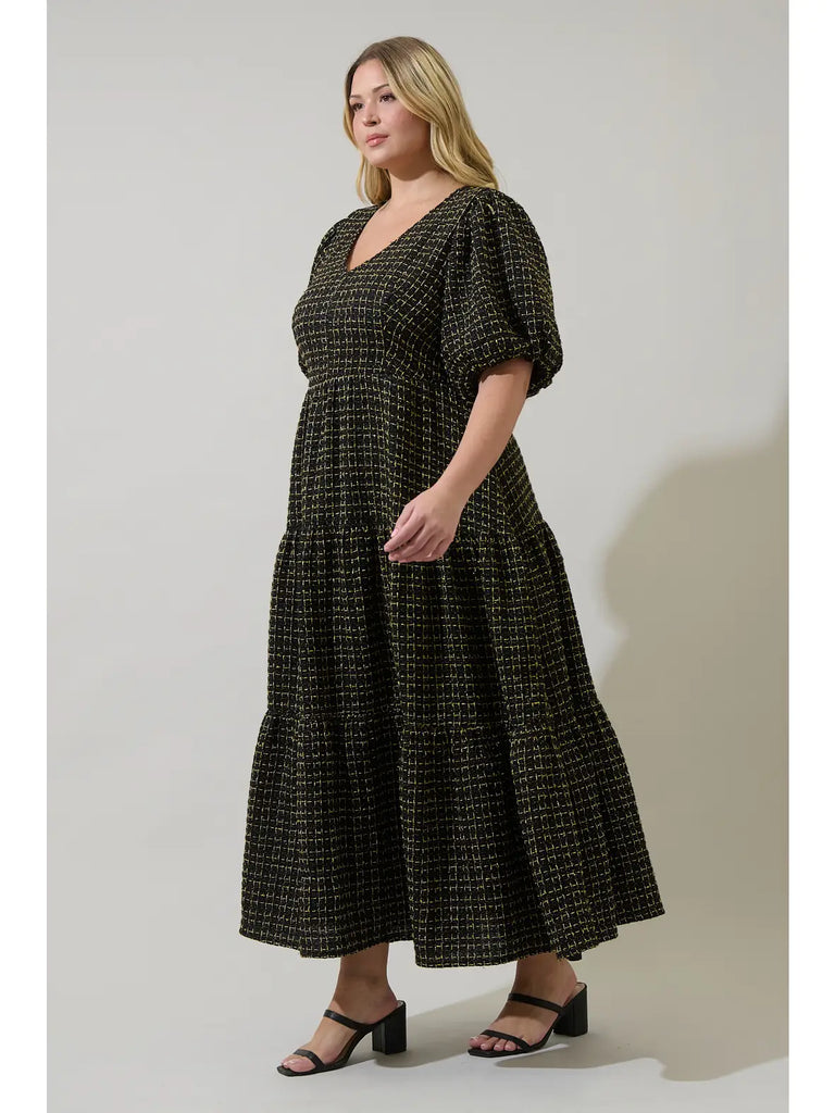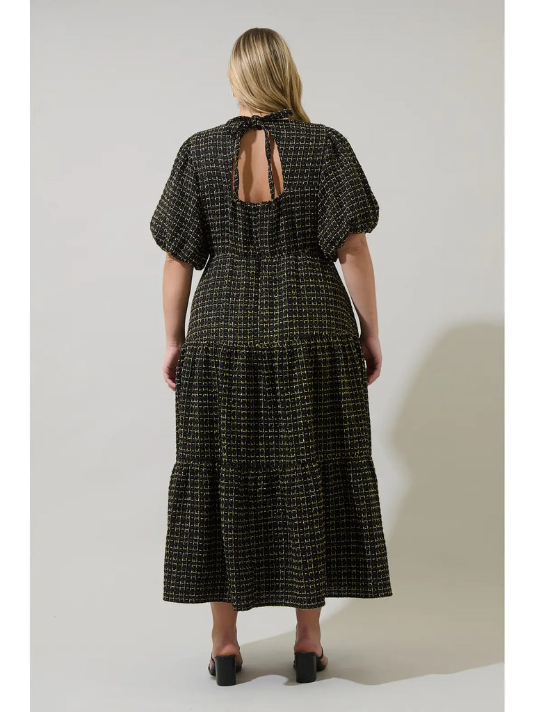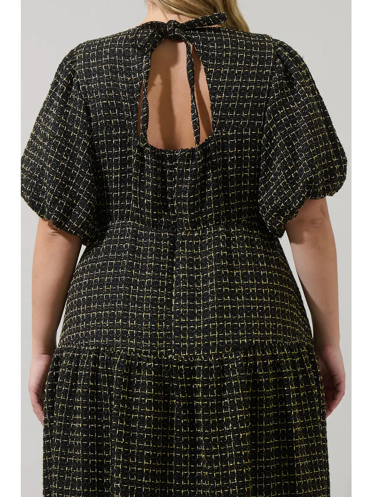 • Make an unforgettable impression in the Carrol Tweed Maxi Dress, designed to elevate your style. Featuring a V-neck, short bubble sleeves, and a tiered skirt, it’s finished with a neck back tie, subtle back opening, and invisible zipper. Pair with open-toe shoes and a structured handbag for a polished look.