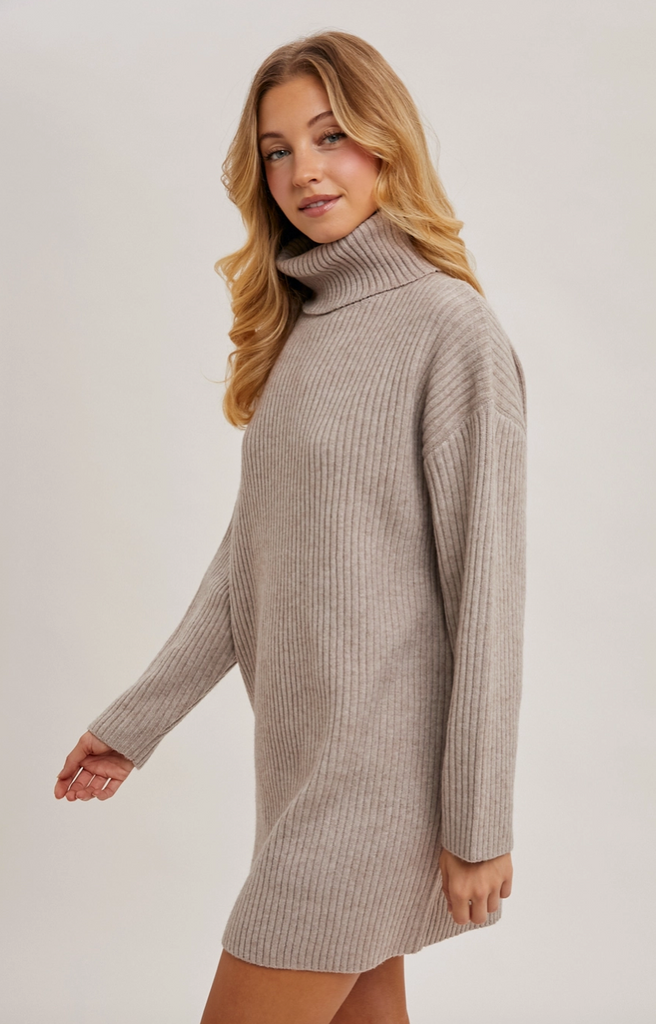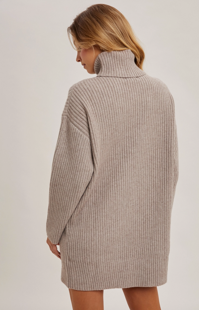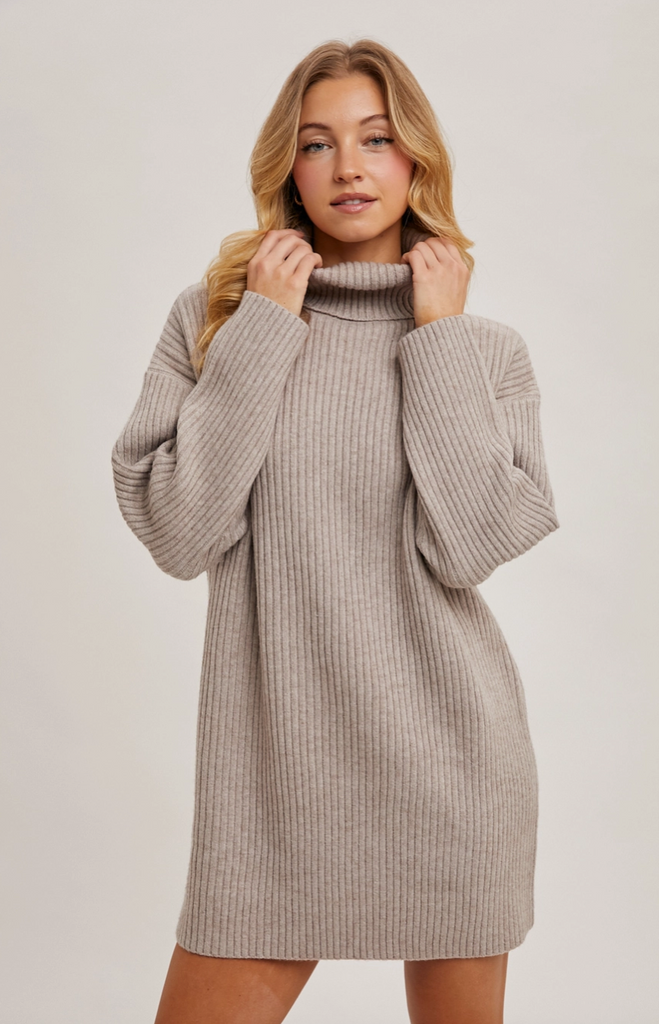 - The turtleneck knit sweater dress is a chic and cozy wardrobe staple. With its high neckline, it provides warmth and a sleek, elongated silhouette. The soft knit fabric ensures comfort, while the dress's relaxed fit offers versatility for layering or wearing alone. Whether paired with boots for a casual day out or dressed up with accessories for a night out, this sweater dress combines style and practicality, making it perfect for cooler seasons.