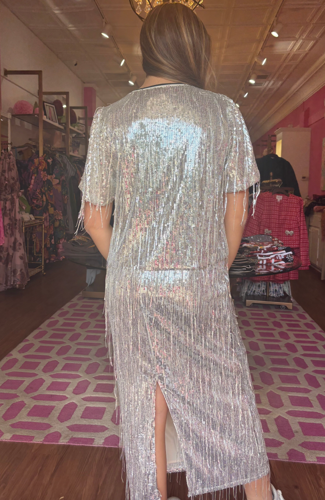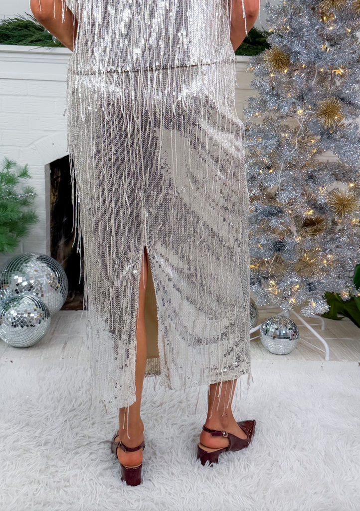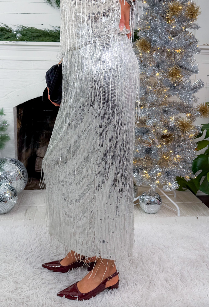 • Sequin fringe maxi skirt with back slit