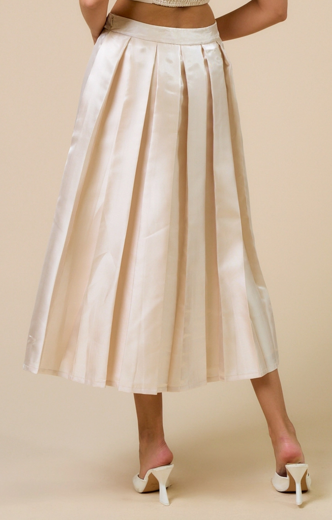 - Flowy and refined, this pleated satin maxi skirt catches the light with every step, offering a graceful silhouette and a luxe finish. Perfect for dressing up with heels or styling down with knits, it's a versatile piece that brings elegance to any occasion.