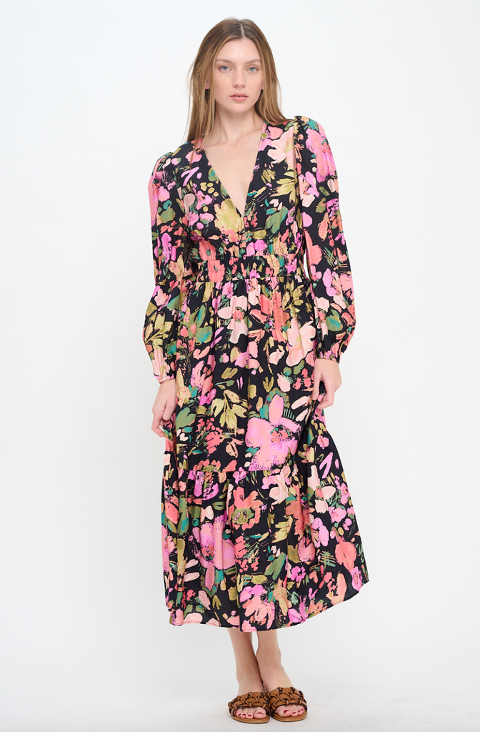 - Let the rich, painterly florals transport you to a twilight stroll through a vineyard overlooking the Aegean. This elegant floral maxi dress features a flattering V-neckline and full, flowing sleeves that lend an air of timeless grace. Unexpected shoulder cut-outs add a touch of modern allure, while the tiered skirt moves with a beautiful, poetic rhythm.