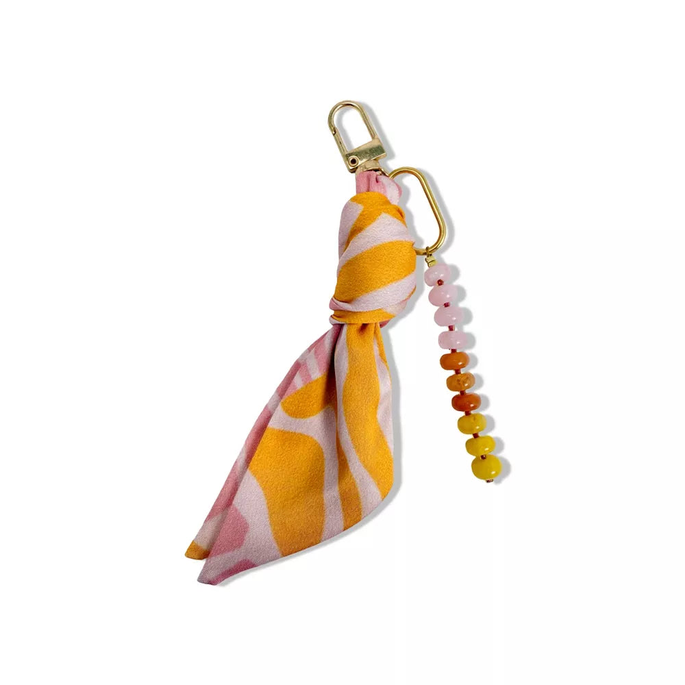 This charm brings romantic energy to your bag with a sweet floral silk and coordinating gemstone strand. It's soft, feminine, and full of charm.
