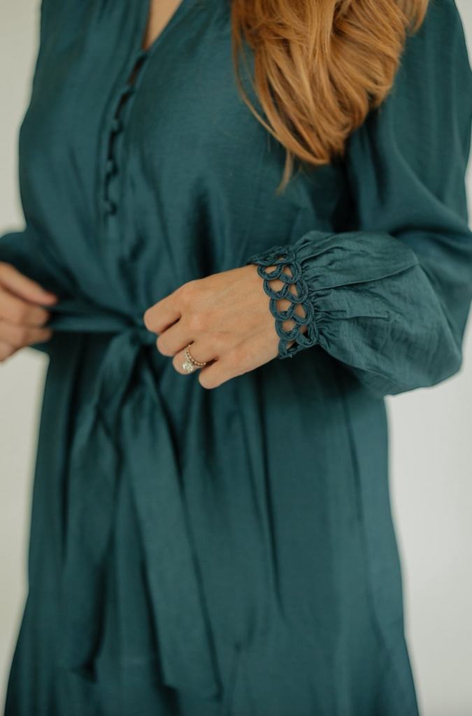 • Crafted in a rich dark teal hue, this midi dress features sleek contrast binding that contours the body and adds a touch of elevated structure. The tailored fit skims your shape, while the midi length offers an effortlessly polished finish