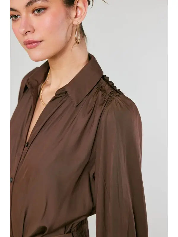 - Long-sleeve split neck collared button-down shirts dress with self-tie.