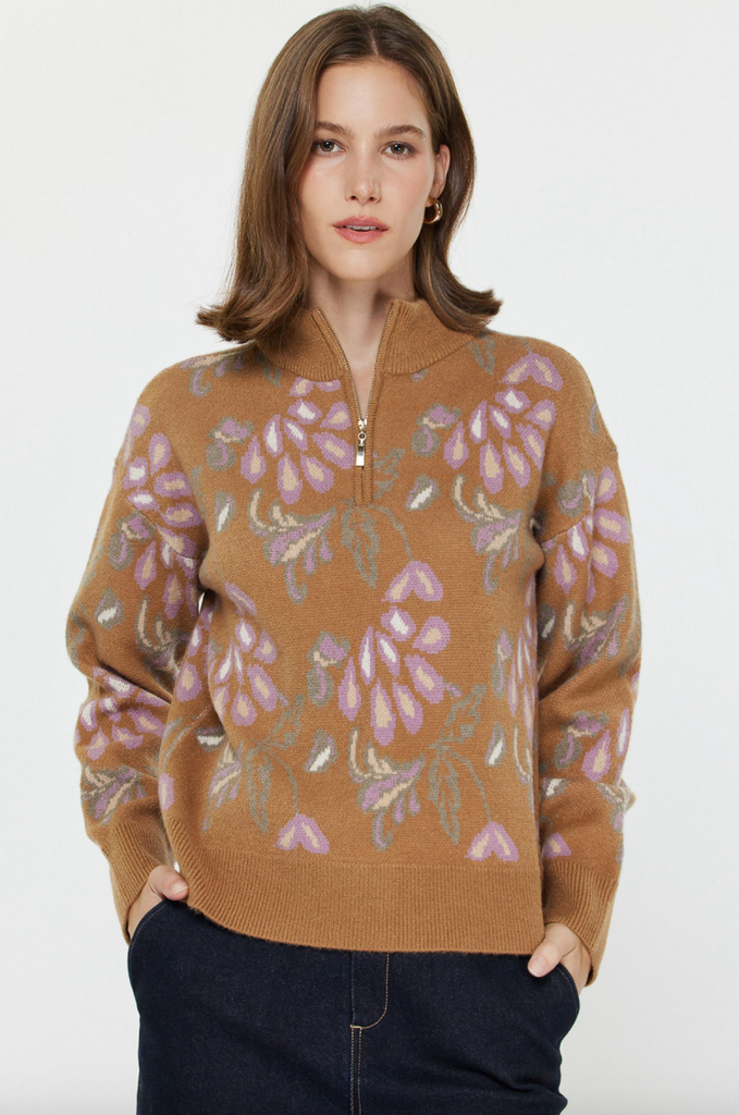 - Pattern jacquard long-sleeve sweater, half zip-up closure for versatile styling