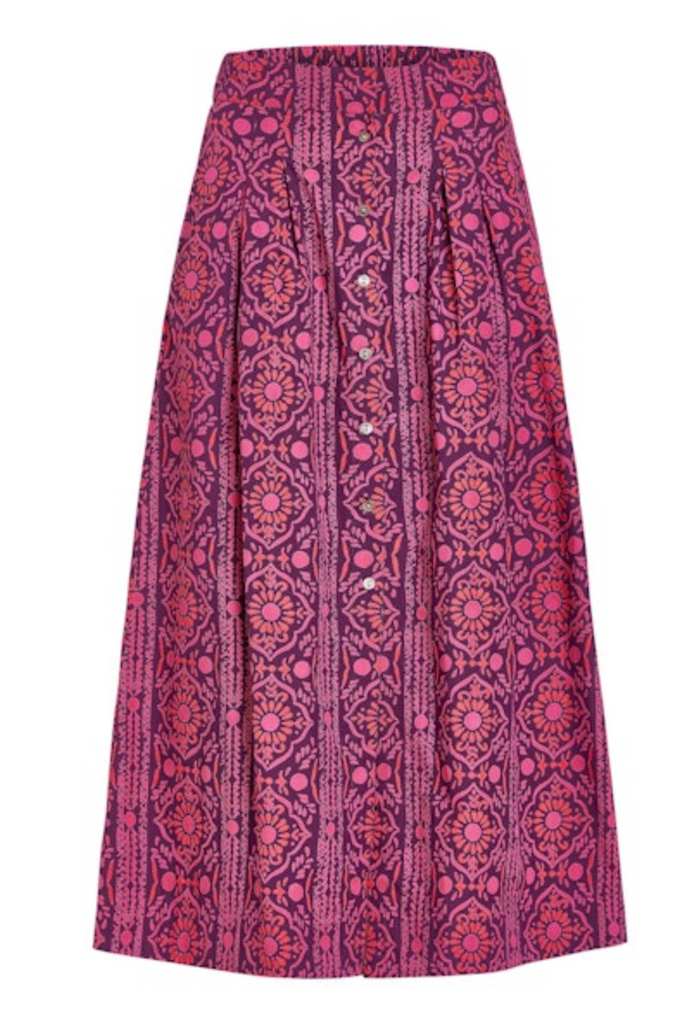 • The Scout Skirt is a high-waisted, A-line silhouette with a flattering midi length. It features a button-front closure, wide waistband, and soft pleating for added volume and ease. Side pockets add a functional touch, making it as practical as it is polished.