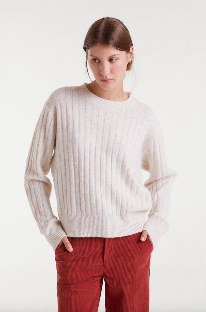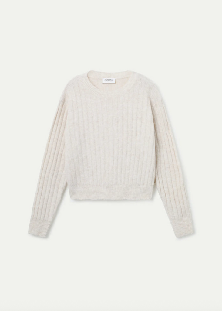 • Knitted sweater with white vertical stripes. Featuring a round neckline and long sleeves with slightly dropped shoulders. Ribbed trim.