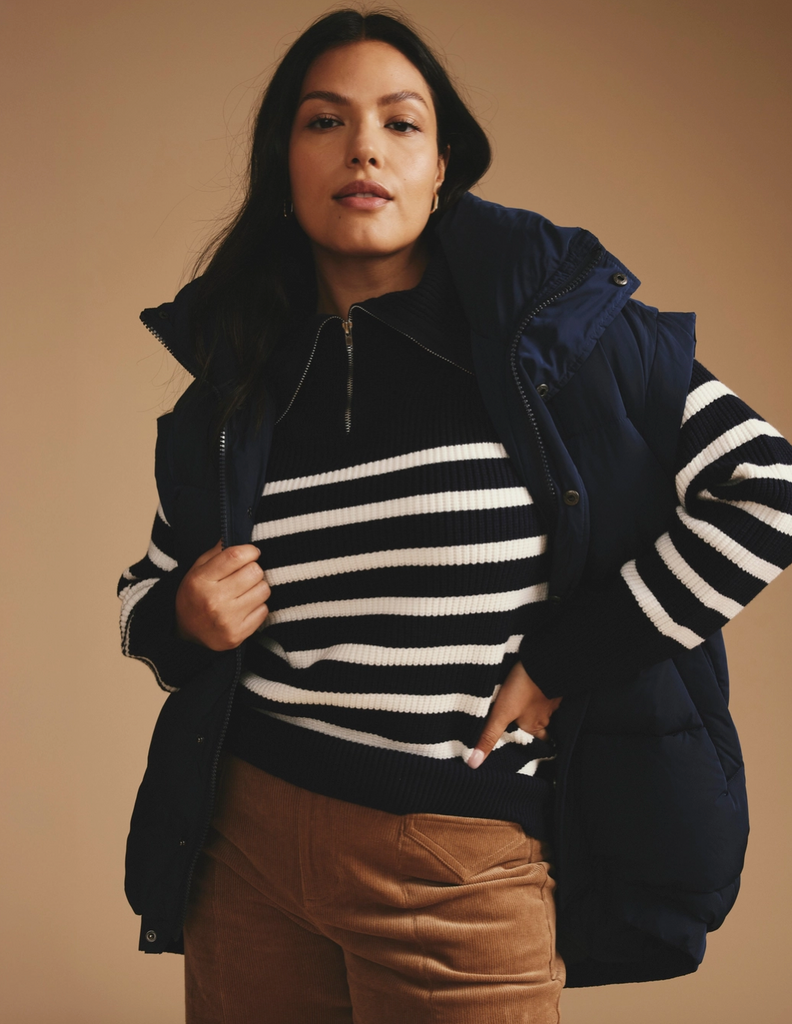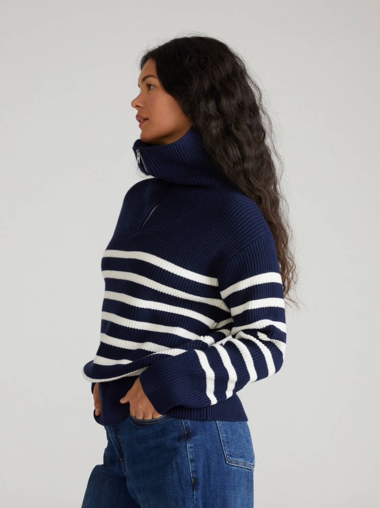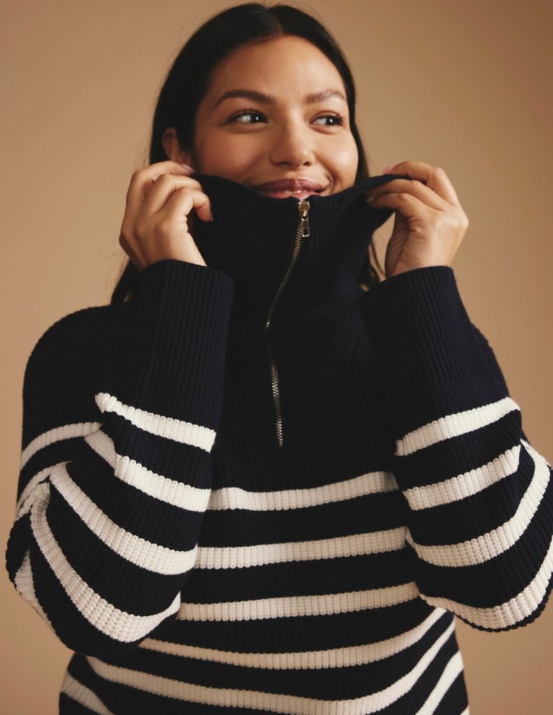 The Brenda Zip Sweater by Universal Standard is a stylish addition to any woman's wardrobe. This navy/cream striped knit sweater is perfect for any occasion.