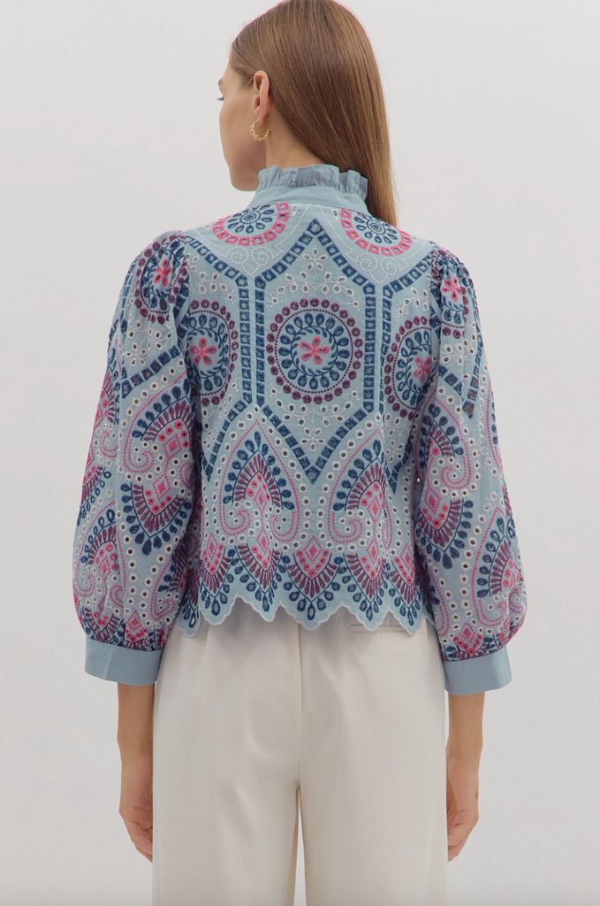 Embroidered eyelet 3/4 puff sleeve top featuring ruffled accent split neck with button closure at front. Scallop hem. Lined. Woven. Non-sheer. Lightweight.