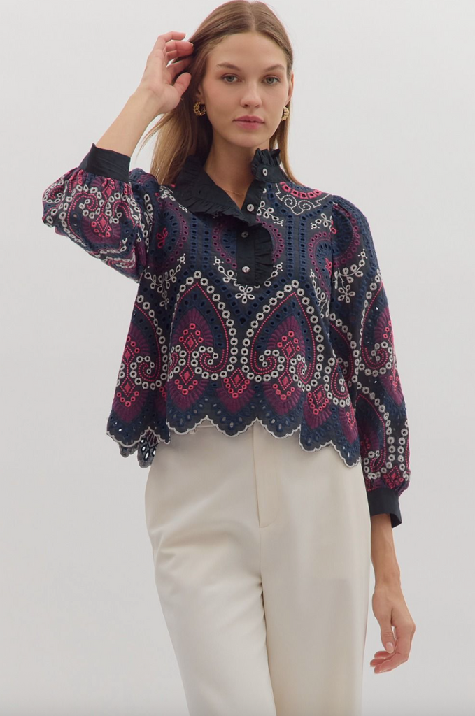 Embroidered eyelet 3/4 puff sleeve top featuring ruffled accent split neck with button closure at front. Scallop hem. Lined. Woven. Non-sheer. Lightweight.