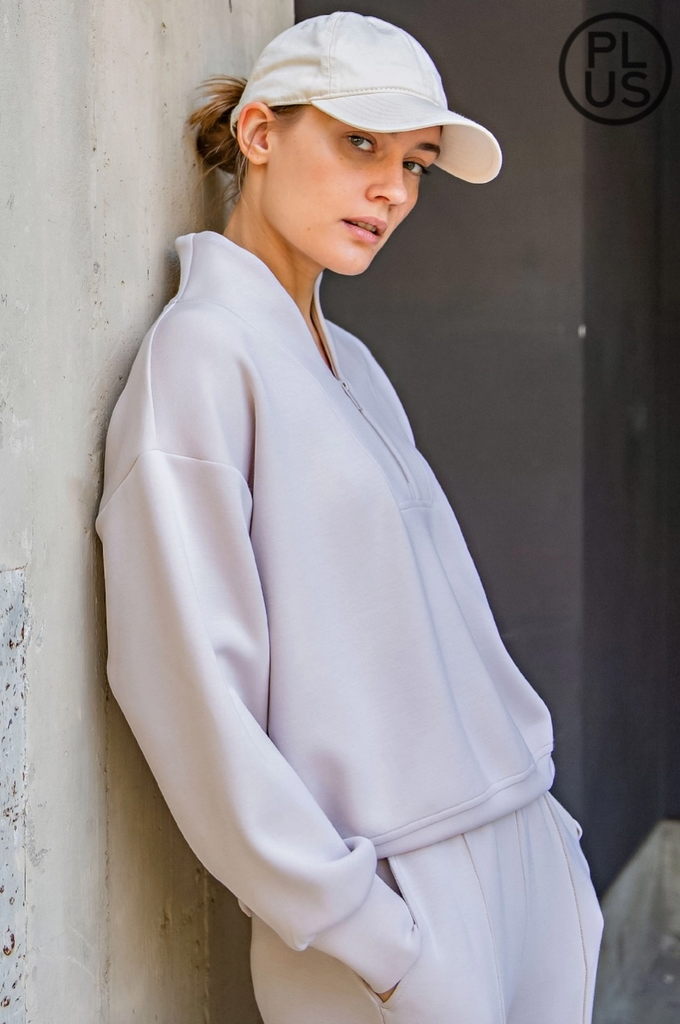 • Crafted from a sumptuous, silky smooth fabric, this jacket is exceptionally soft and lightweight for a luxurious feel. The oversized fit exudes a laid-back vibe, complemented by the half zipper closure and bubbled sleeves, creating a fashion-forward look. With a convenient front pocket and dropped shoulder design, this jacket seamlessly combines comfort and trendiness.