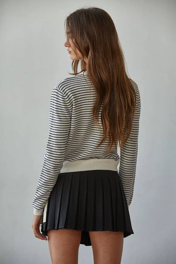 • This soft, slightly cropped, black and natural striped crew neck cardigan will be your go-to sweater this fall and beyond.