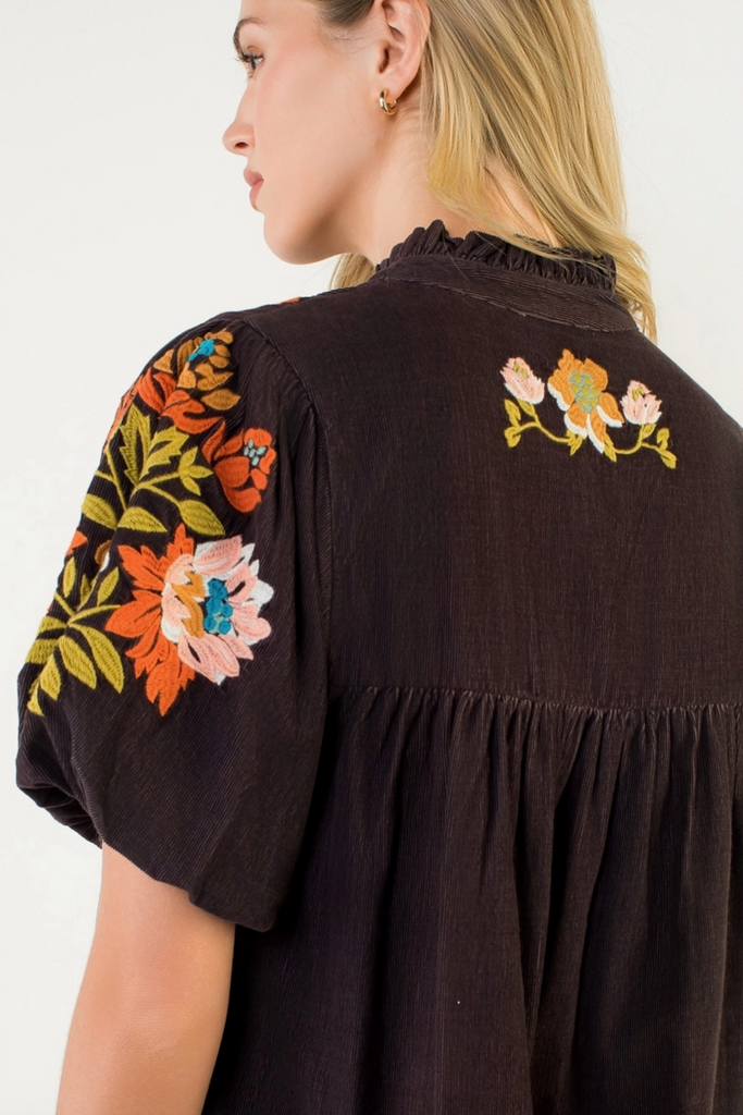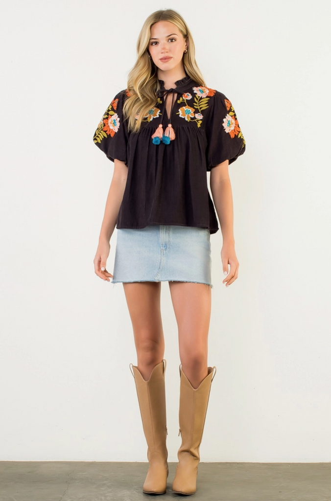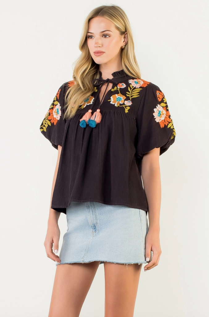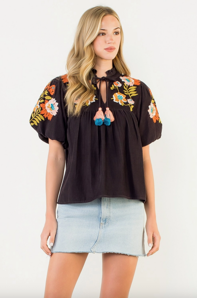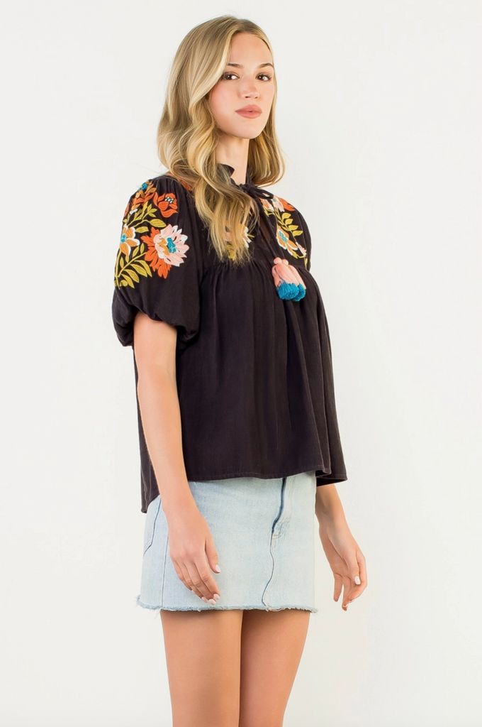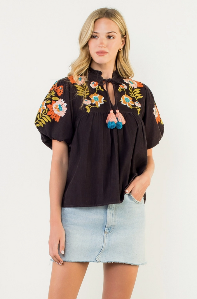 • Puff Sleeve Embroidered Detail Tie Tassel Top
