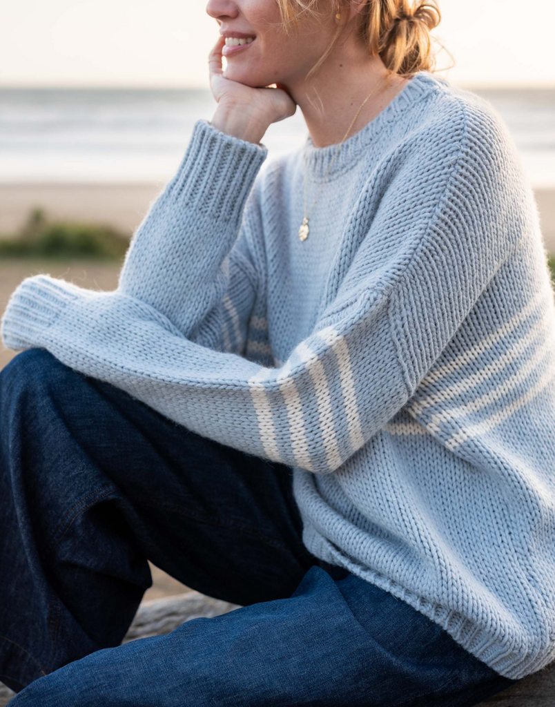 - This is the sweater that feels like home in the coziest way. The fuzzy knit and three-stripe detail are the perfect pair for a homey and stylish look. Layer it with a turtleneck or wear it on its own. This is your classic fall sweater to wear with your favorite pair of jeans and sneakers to make crisp walks warm and every day feel like home no matter where you are. We are suckers for sweaters we can wear for a long time and this one is our newest obsession.