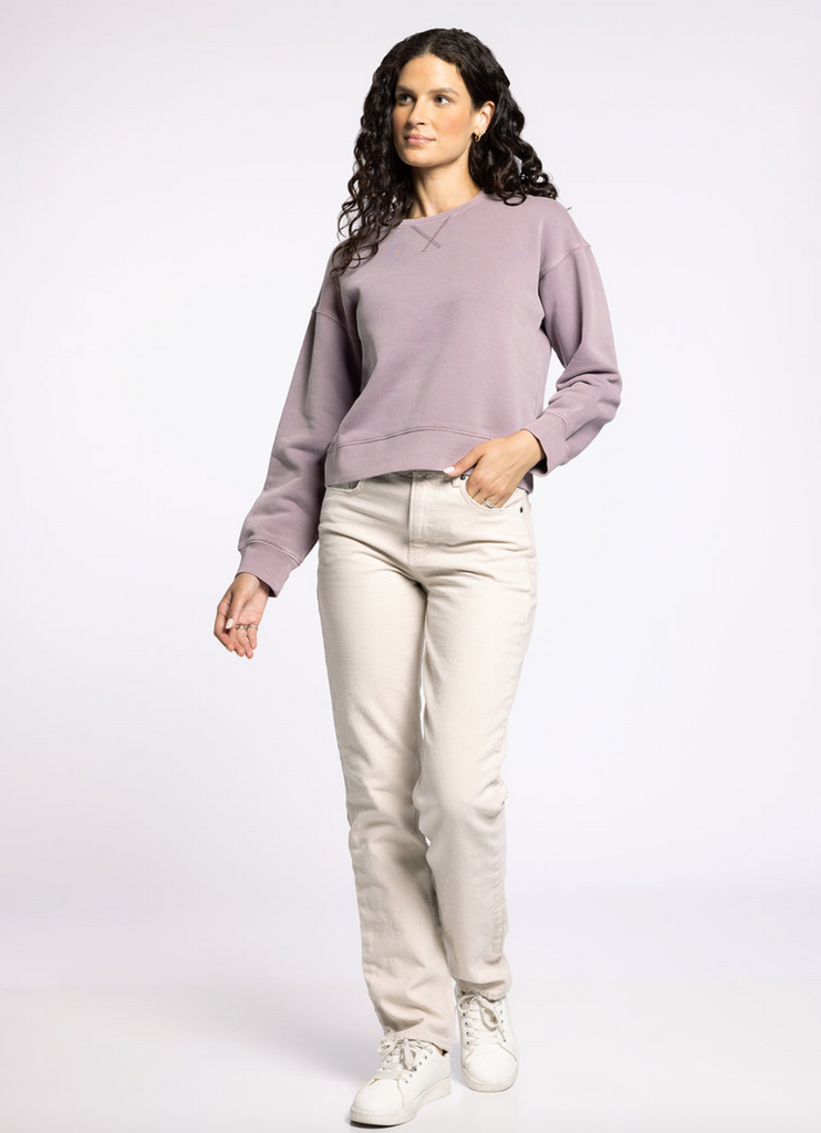 Meet our newest fabric - Serenity Fleece! Serenity fleece is ultra-soft and cozy with a buttery plush yet lightweight feel, super comfy, without the bulk. The crewneck is featured in a drop shoulder silhouette for a relaxed fit.