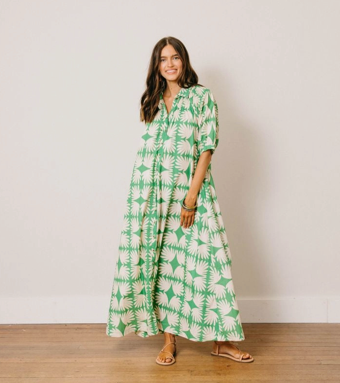 The Viridian Tile Oasis Dress is made for slow mornings, sun-soaked afternoons, and everything in between. Designed with a classic button-down front, soft puff sleeves, and breathable cotton, this effortless silhouette drapes beautifully for an easy, airy feel. The fresh green tile print adds a playful pop—perfect for garden strolls, vacation days, or dressing up with a straw hat and sandals for golden hour plans.