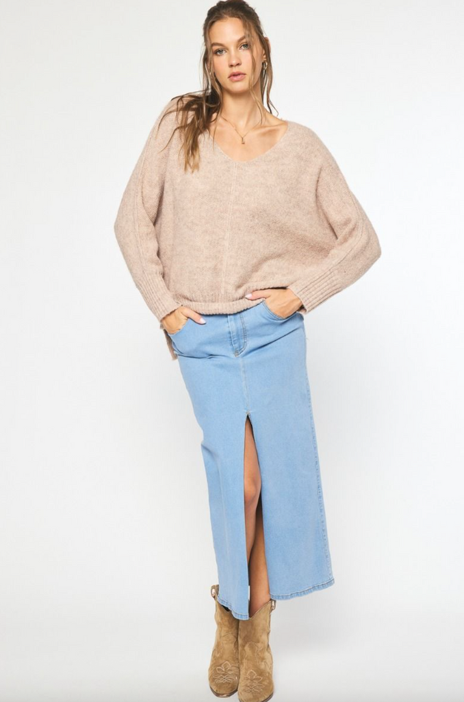 • Solid v-neck long-sleeve knitted top featuring seam detail. Slit at sides. Unlined. Knit. Non-sheer. Lightweight.