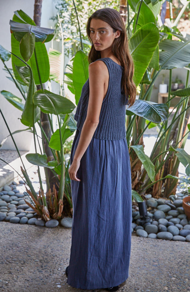 • Knit round neck sleeveless flare midi dress with open back tie strap detail