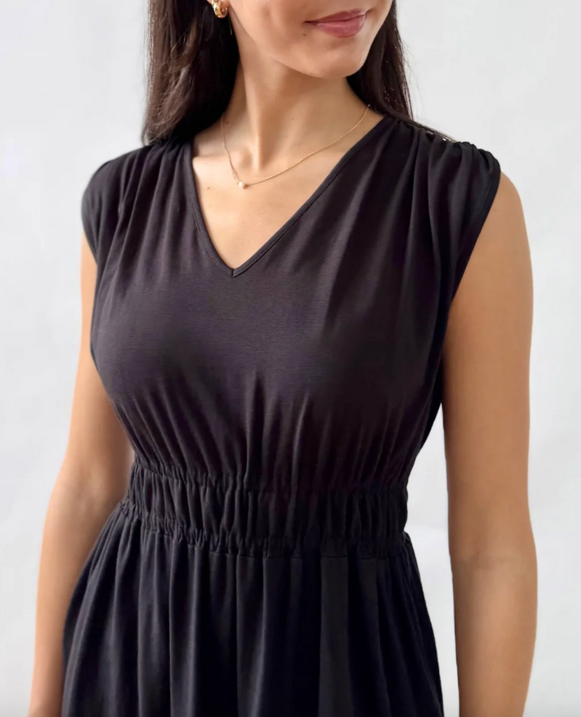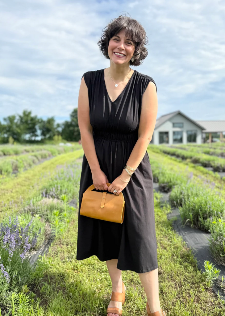 Possibly our most flattering dress ever! Enjoy the lightweight and breathable fabric crafted with gathering that gently drapes over your body. Even if you aren't a fan of showing your arms, the armholes are cleverly designed (don't mind our brag), but the cut really will make you feel your best in this dress! Pockets are hidden in the side seams.