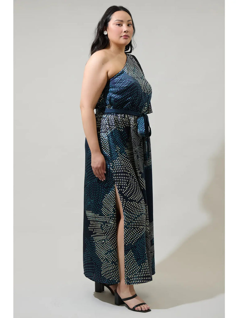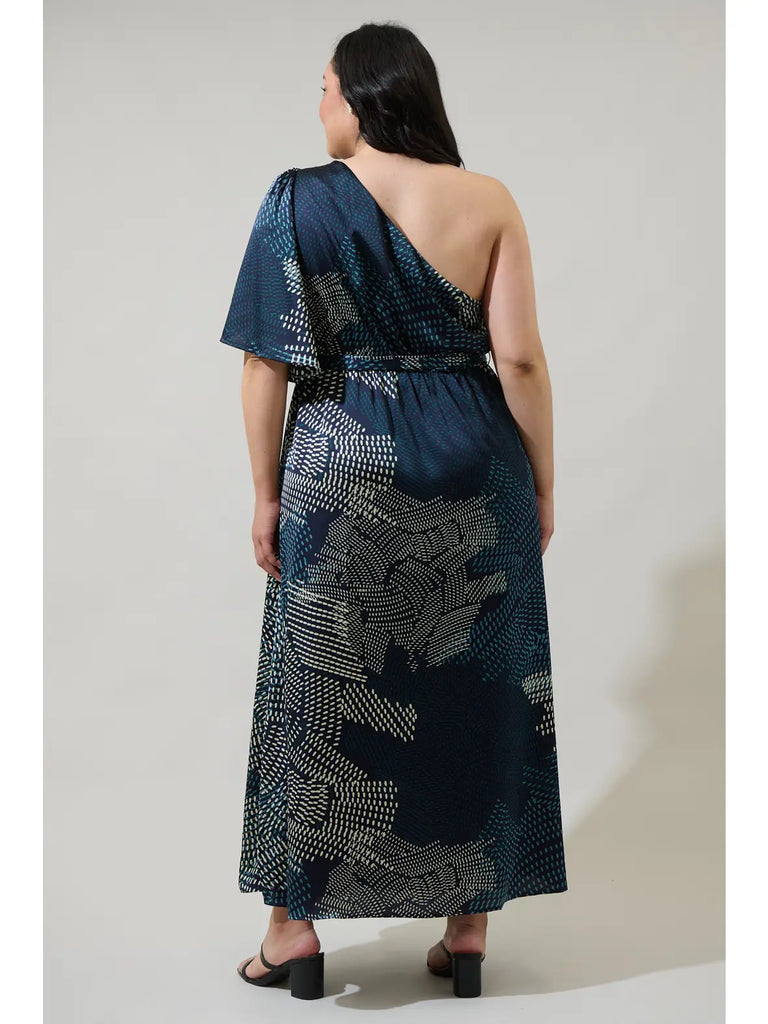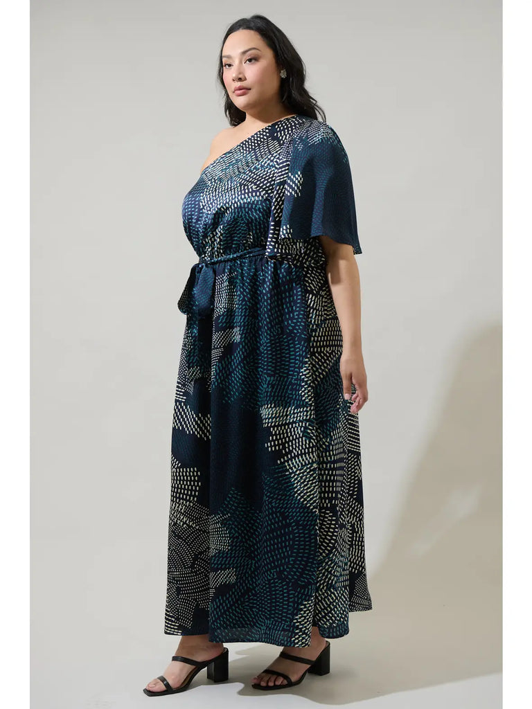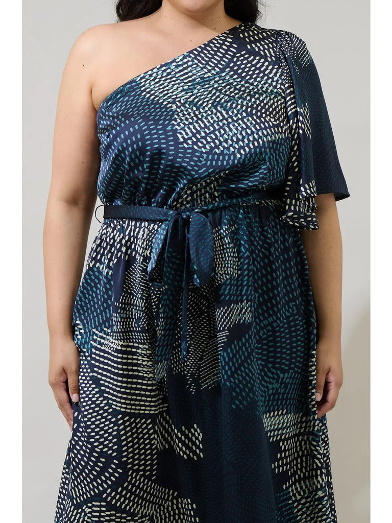 • The cute cream and blue print , a satin one shoulder dress with a flouncy short sleeve. An elastic waist allows ease and features a sash style belt to top an elongated skirt. Perfect to pair with wedges or any heels.