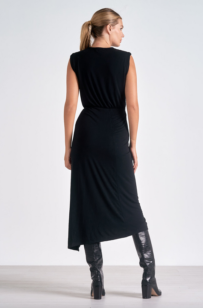 • Sleeveless midi dress with gathered detail and slit