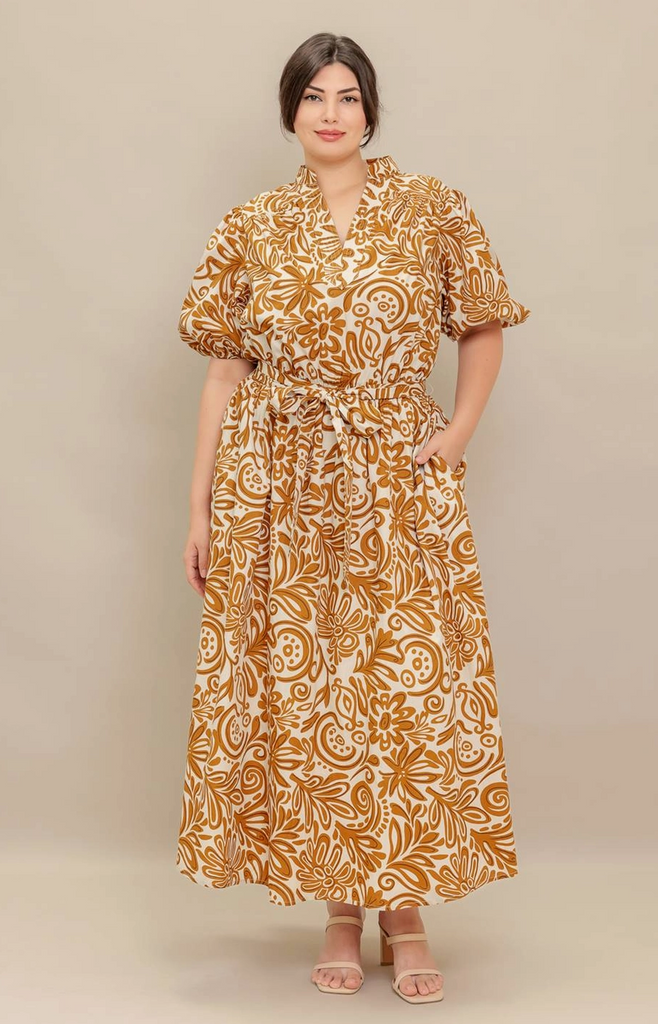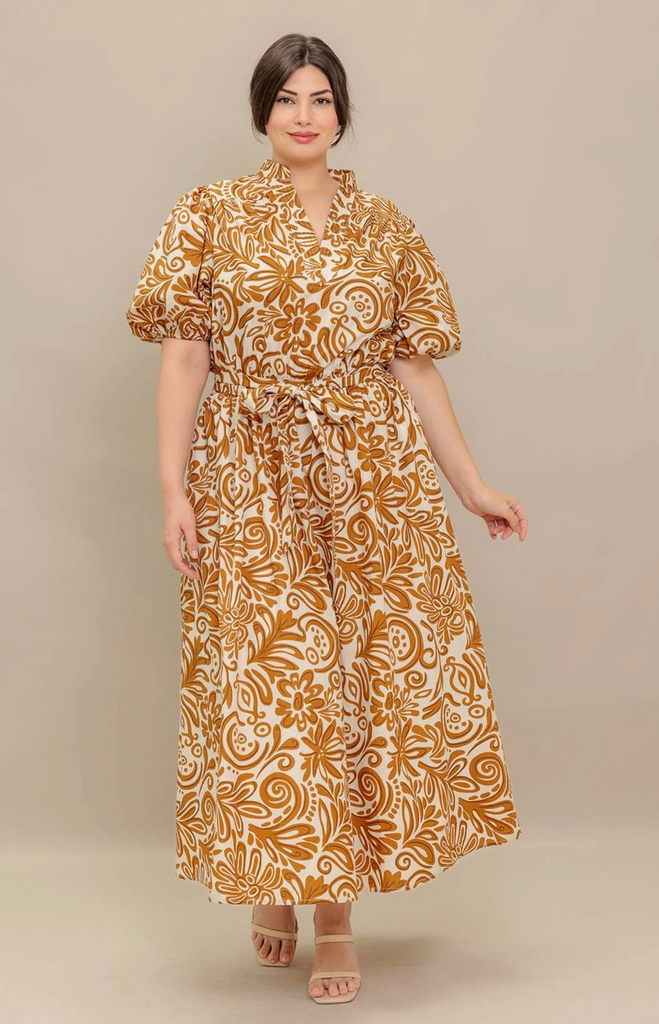 A printed woven midi dress featuring high neckline with center front V, short puff sleeve and elasticized waist with self sash tie