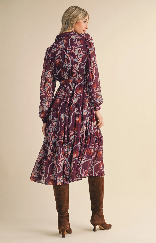 • Paisley print ruffle tiered button down midi dress. Collared neckline with button down placket. Long puff sleeves with buttoned cuffs. Elastic waist with tying sash belt.