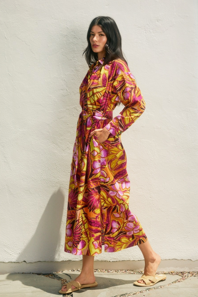 • Cotton dark tropical printed midi dress with a wicker circle buckled belt.