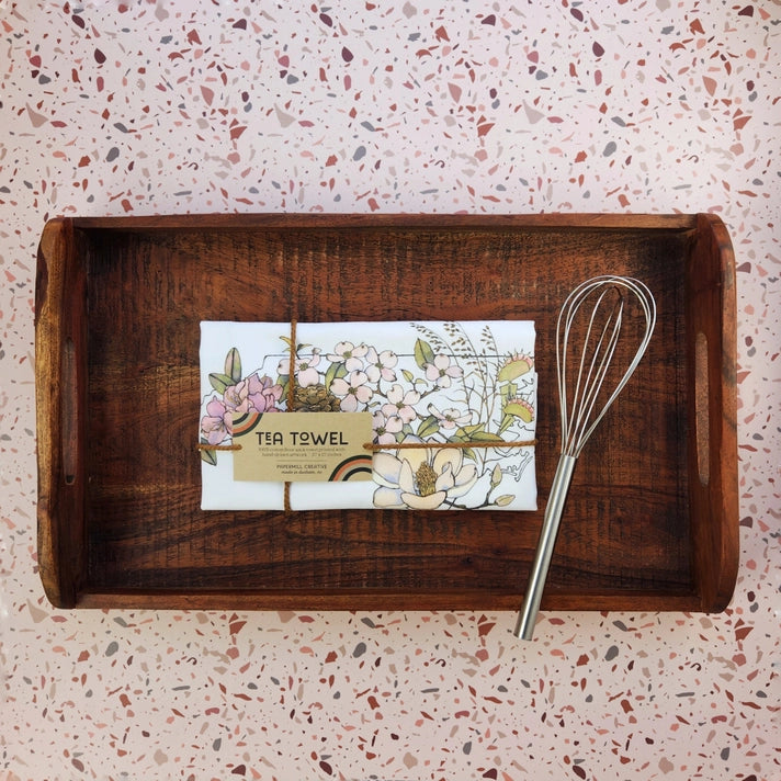 This beautifully detailed tea towel features a watercolor painting of native plants from North Carolina's mountains to the sea, created by a pen-and-ink and watercolor artist based in Durham, North Carolina.