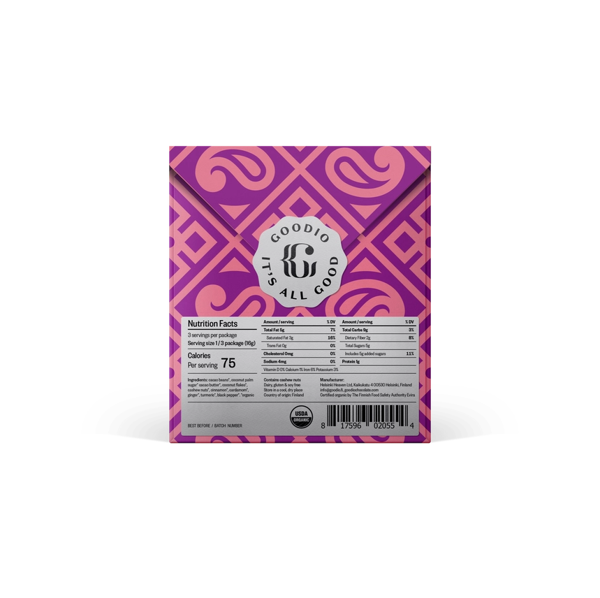 - INGREDIENTS: cacao bean*, coconut palm sugar*, cacao butter*, coconut flakes*, cashew nut*, cinnamon*, cardamom*, ginger*, turmeric*, black pepper*. *organic