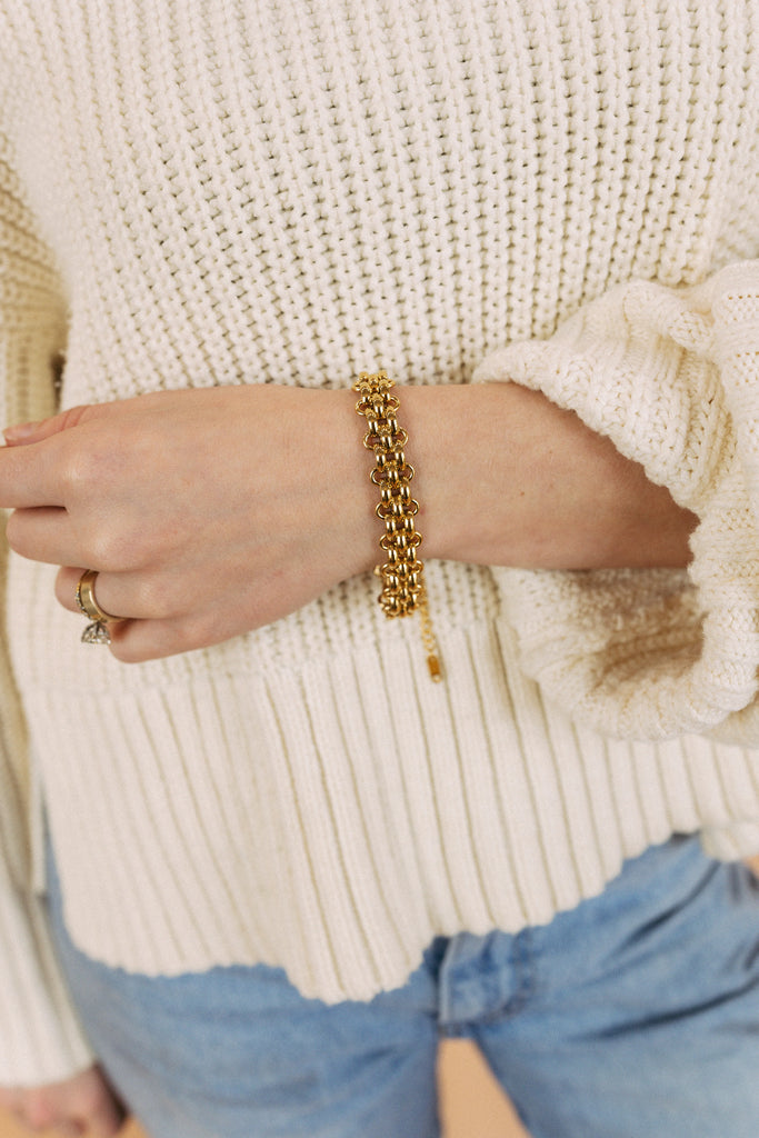 Bold, timeless, and effortlessly chic. This gold chunky chain bracelet makes a statement on its own but also pairs perfectly with your everyday stack. A must-have piece for adding a touch of shine and confidence to any look.