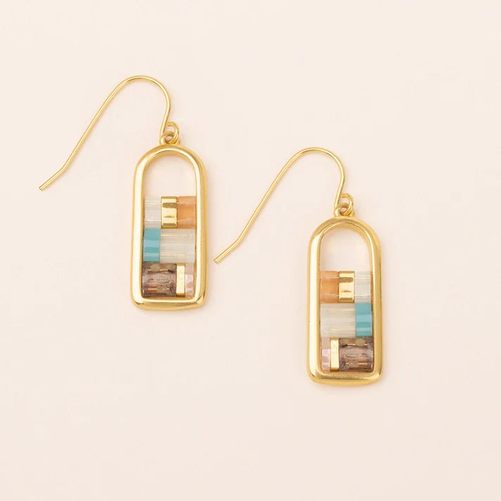 Playful and sleek combinations of matte and pearlescent glass beads are framed by modern metallic shapes.