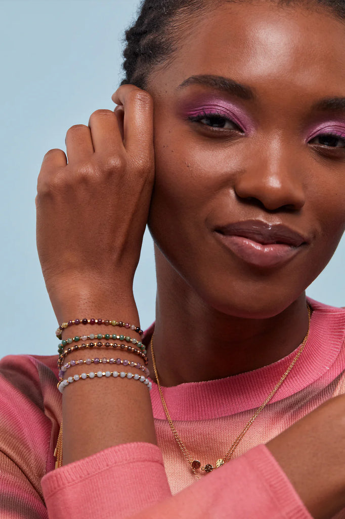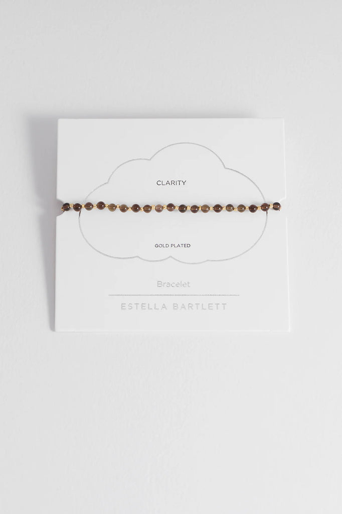 Our classic Amelia bracelet is dotted with smoky quartz and gold plated beads with a slider fastening, making it suitable for any wrist size. Smoky quartz is thought to reduce negativity and promote positive thoughts.