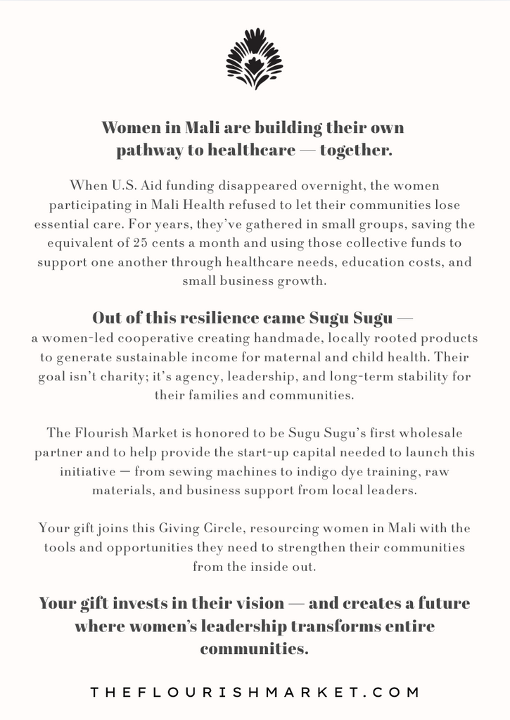 They created Sugu Sugu: a women-led cooperative launching handmade, natural products rooted in Malian tradition - with profits designed to sustain healthcare access for mothers and children. They’re starting with shea butter soaps and gorgeous indigo pillowcases with the dream of being picked up by stores across the globe. The Flourish Market is excited to be their first wholesale partner!
