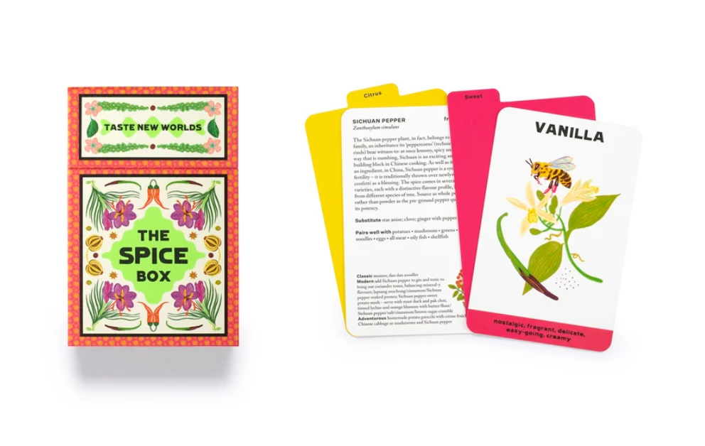 60 beautifully illustrated cards with ingredient pairings, cooking tips, original recipe ideas and fascinating facts about each spice from acclaimed chef Emily Dobbs. Organized into six categories - aromatic, citrus, earthy, sweet, hot and pungent - and served in a stunning tabbed archive box, The Spice Box is the essential kitchen companion.