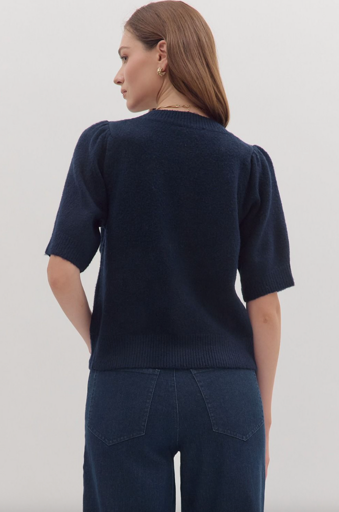 Solid short puff sleeve sweater knit top featuring floral applique detail. Unlined. Knit. Non-sheer. Medium weight.