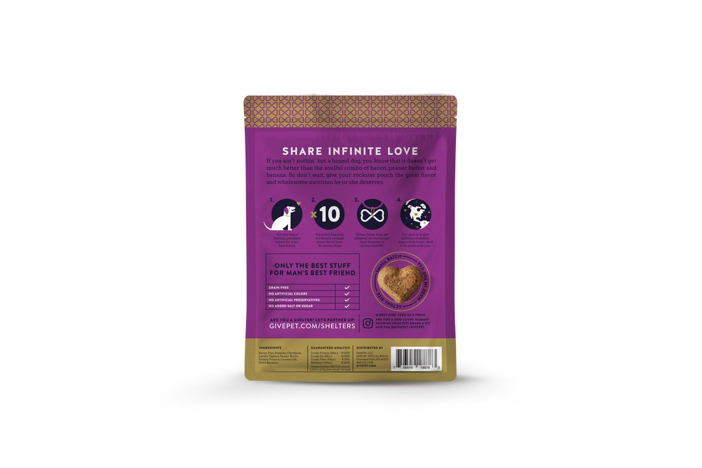 If your pup ain't nothin' but a hound dog, they’ll love this soulful combo of bacon, peanut butter, and banana. These baked biscuits are packed with flavor and wholesome nutrition, giving your rockstar pooch the treat they deserve—without any added salt or sugar.