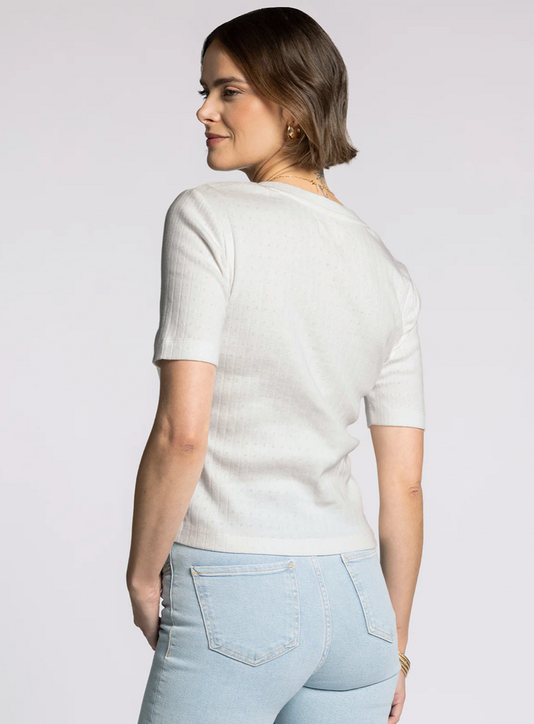 Delicate and darling, this twist on a classic tee is featuring a soft pointelle fabric, v neckline and relaxed fit.